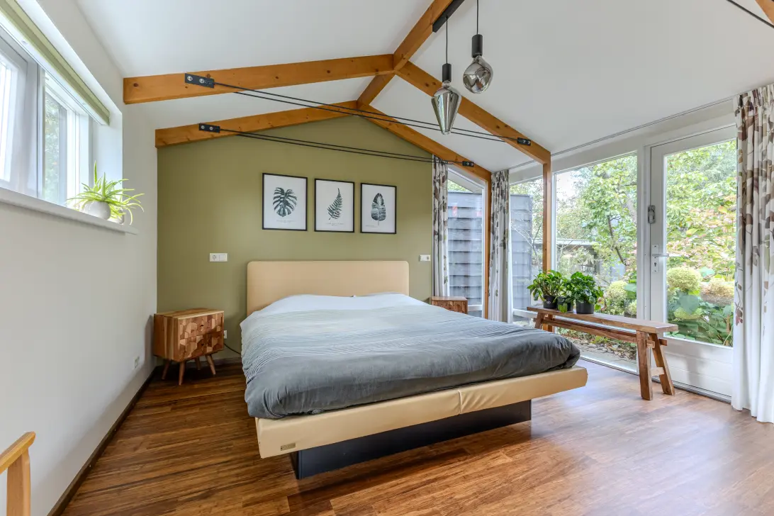 De ingrediënten zijn uniek: een eigen eiland, vrijstaand huis, grote garage/ werkplaats, een weelderige tuin, genoeg leefruimte en veel privacy. Deze sfeervolle woning is met zorg onderhouden en met de tijd meegegaan. Het originele huis dateert uit 1930 en is door de jaren heen flink verbouwd en uitgebouwd, zonder de charme weg te nemen. Zo is er een serre grenzend aan de woonkamer gemaakt. Hier is een plezierig lichte en fijne kamer ontstaan. Achter de serre ligt een extra slaapkamer op de begane grond met uitzicht op de tuin en het terras. Omdat de badkamer ook op de begane grond ligt is gelijkvloers wonen hier mogelijk. De vernieuwde keuken is compleet uitgerust met moderne apparatuur. De woonkamer is strak en sfeervol afgewerkt met een houten vloer, glad gestuukte wanden en plafond, prachtige glas-in-loodramen, paneeldeuren met glas en een gezellige houtkachel. Op de 1e verdieping bevinden zich nog eens drie slaapkamers en er is een vliering voor extra bergruimte. Het erf is riant. Naast het parkeren van meerdere auto’s op eigen terrein is er een grote garage annex werkplaats aanwezig en een extra houten berging. De tuin is fraai aangelegd. Er is een kas voor het kweken van eigen groentes, een beschut terras en grasveld. Op het terras kan men van het vroege voorjaar tot het najaar heerlijk uit de wind buiten zitten. Alles is omgeven door veel bomen waardoor er veel privacy is en in warme zomers genoeg schaduwplekjes.
