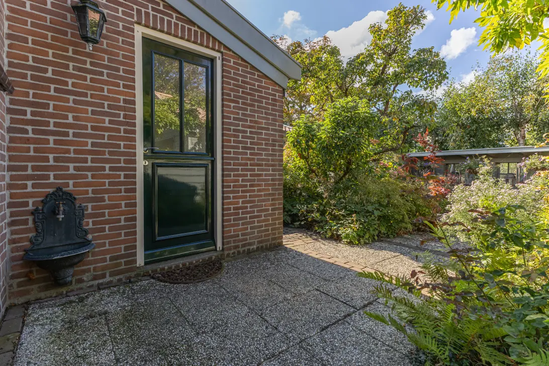 Tuin: omdat de woning op een eiland staat ligt de tuin rondom. Via de dijk, waar enkel bestemmingsverkeer rijdt, is de eigen brug met oprit bereikbaar waar ruimte is om meerdere auto’s te parkeren. Er staat een vrijstaande houten garage op het erf alsmede een tweede berging. De tuin is met zorg aangelegd en onderhouden. Er staan verschillende fruitbomen, diverse bloemen, planten en kruiden. Voor op het erf staat een kas voor het telen van uw eigen groenten. Het beschutte terras is gelegen op het westen. Hier is het in het vroege voorjaar al heerlijk om uit de wind buiten te zitten. Het perceel strekt zich uit naar het noorden, waar het grasveld tal van mogelijkheden biedt. Via de gemeente is het mogelijk om een ligplek voor uw boot te huren aan de Nauernasche vaart. De boot kan ook aan het eigen eiland gelegd worden, dan vaart u via het sluisje de Vaart op richting de Zaan of het Uitgeestermeer.