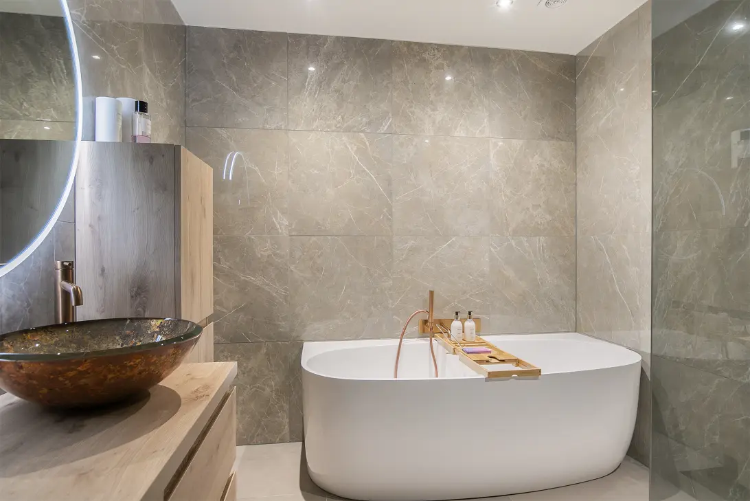 De moderne badkamer met luxe uitstraling is volledig betegeld en uitgerust met een losstaand ligbad, wastafelmeubel, radiator en een inloopdouche. Dit is dé ruimte om te ontspannen!