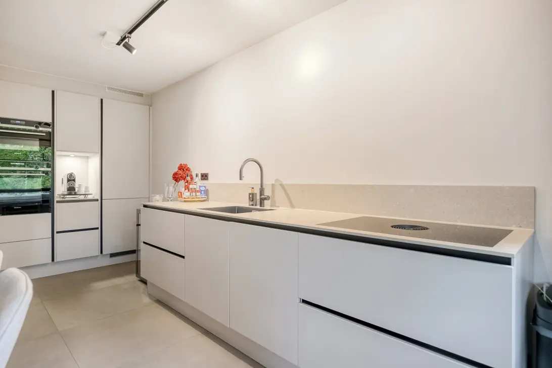 De moderne keuken is voorzien van een natuurstenen werkblad, Quooker (kokend water én bruisend water), een Bora kookplaat met ingebouwde afzuiging, een koel-vriescombinatie, een oven, een combi-magnetron en een vaatwasser.