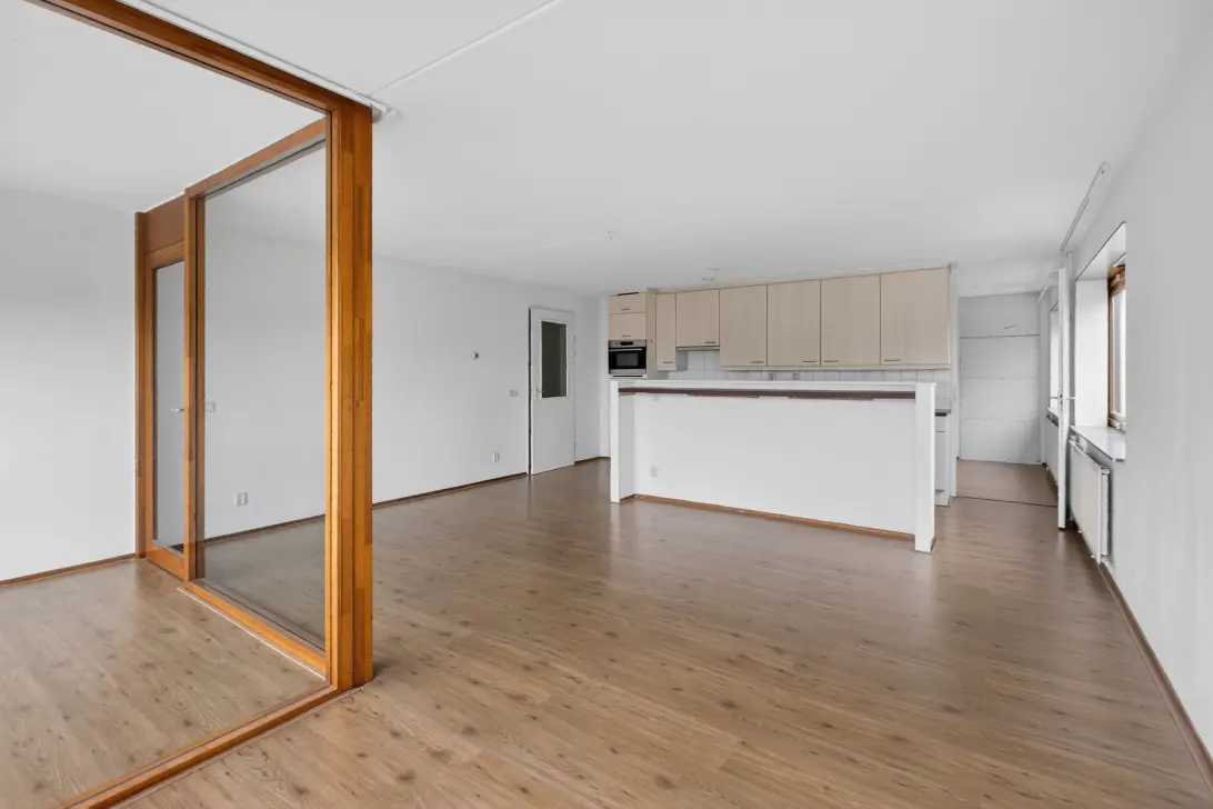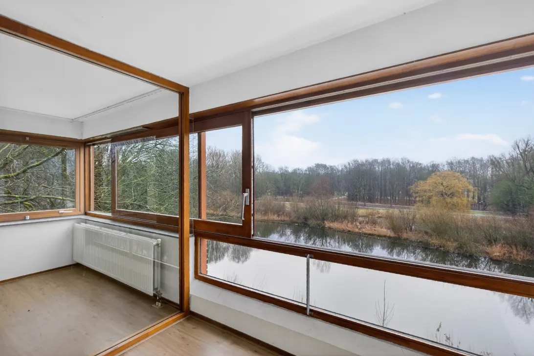 De woonkamer is licht en prettig ingedeeld, met voldoende ruimte voor een zit- en eethoek. De aangrenzende loggia met grote raampartijen biedt een prachtig uitzicht over het water en het Sloterpark. Deze ruimte vormt een fijne verlenging van de woonkamer, ideaal om het hele jaar door van het uitzicht te genieten.