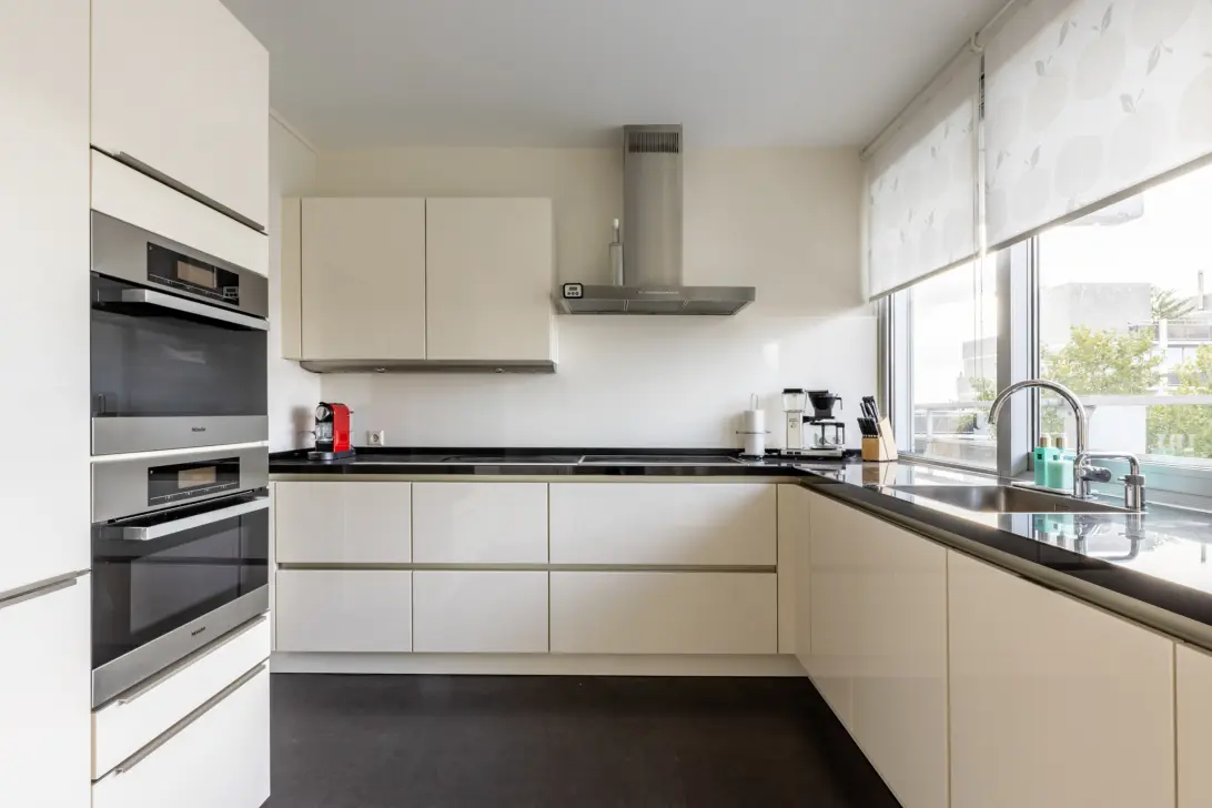 5e Verdieping: entree, ruime hal met garderobe, ingebouwde kast en toilet met fonteintje. Royale living met schuifpui naar het zonneterras, dichte keuken met inbouwapparatuur, hoofdslaapkamer met inbouwkast voor wasmachine en droger en toegang tot de en-suite badkamer met inloopdouche en dubbele wastafel, tweede slaap-/werkkamer.