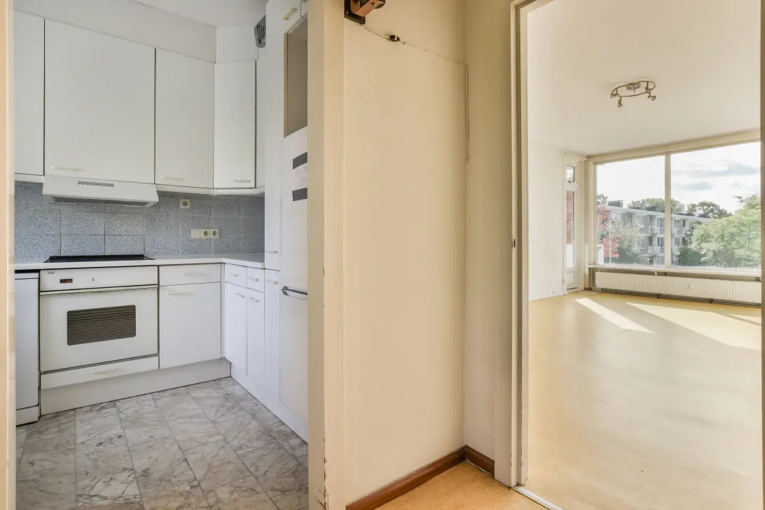 Entree/hal met meterkast en toegang tot de (gesloten) keuken en woonkamer. De keuken bevindt zich aan de voorzijde van de woning. Indien gewenst kan de tussenwand tussen de keuken en de woonkamer eenvoudig worden verwijderd, waardoor een ruime en lichte open woonruimte ontstaat met lichtinval van zowel de voor- als achterzijde.