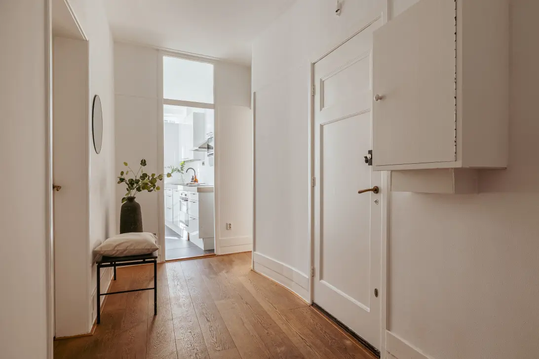 Aan de voorzijde van de woning bevinden zich nog twee slaapkamers, die dankzij hun indeling en uitstraling flexibel inzetbaar zijn. De grootste kamer is momenteel ingericht als slaapkamer en valt op door de grote ramen met fraai glas-in-lood bovenlichten en de praktische kantel-kiep ramen die zorgen voor extra gebruiksgemak. Er is voldoende ruimte voor een tweepersoonsbed en een kledingkast, waardoor deze kamer ideaal is als hoofdslaapkamer. De tweede kamer aan de voorzijde is wat kleiner van formaat, maar leent zich uitstekend als kinderkamer, logeerkamer of juist als rustige werkkamer. Ook hier dragen de houten vloeren en klassieke details bij aan de warme, uitnodigende sfeer van het appartement.