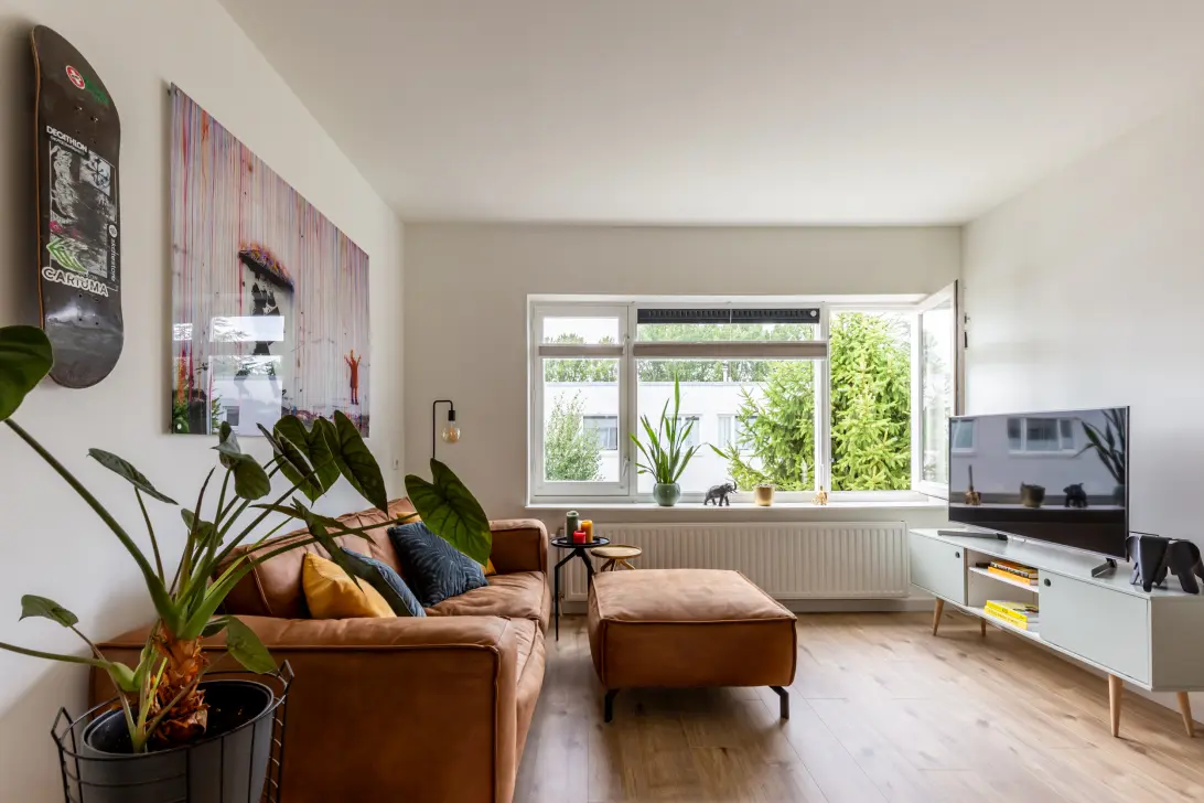 Aan de voorzijde ligt de lichte woonkamer met grote ramen die zorgen voor veel daglicht. De woonkamer staat in open verbinding met de moderne keuken (2021) die is voorzien van inbouwapparatuur. In de keuken geeft de deur toegang tot het balkon.