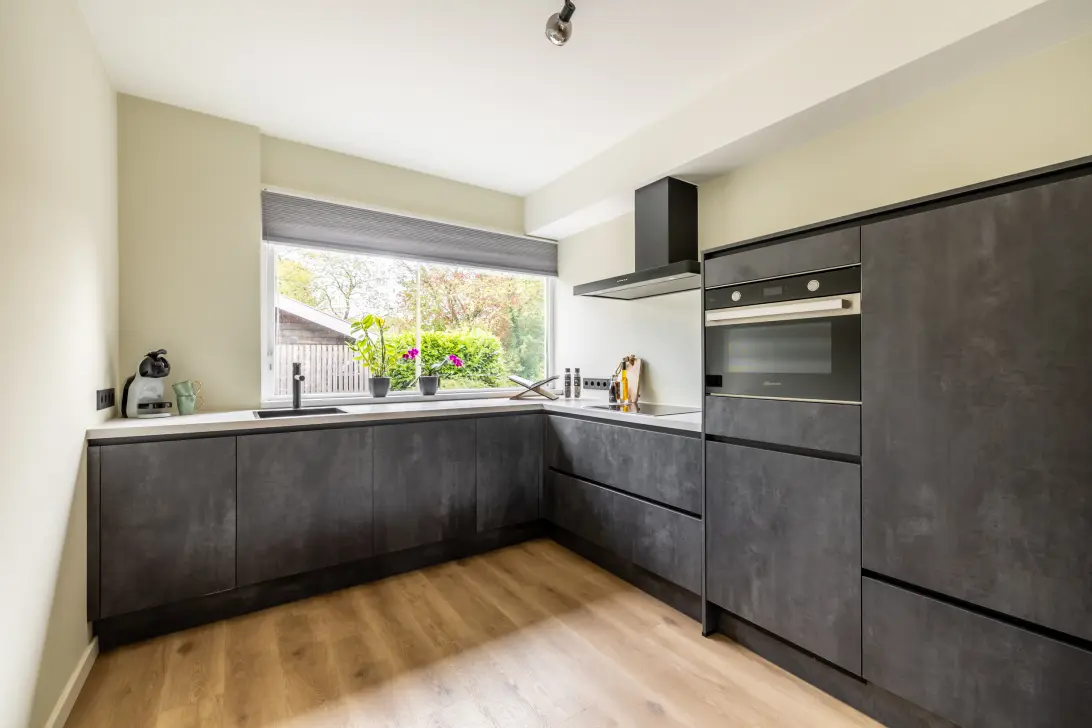 Aan de voorzijde ligt de nieuwe keuken, strak in stijl en praktisch ingericht. Of je nu snel een doordeweekse maaltijd maakt of uitgebreid wilt koken in het weekend: hier kan het allemaal. Vanuit de woonkamer loop je zó de tuin in — daarover straks meer. Extra handig: de inpandige berging voor je voorraad, fietsen of seizoensspullen.