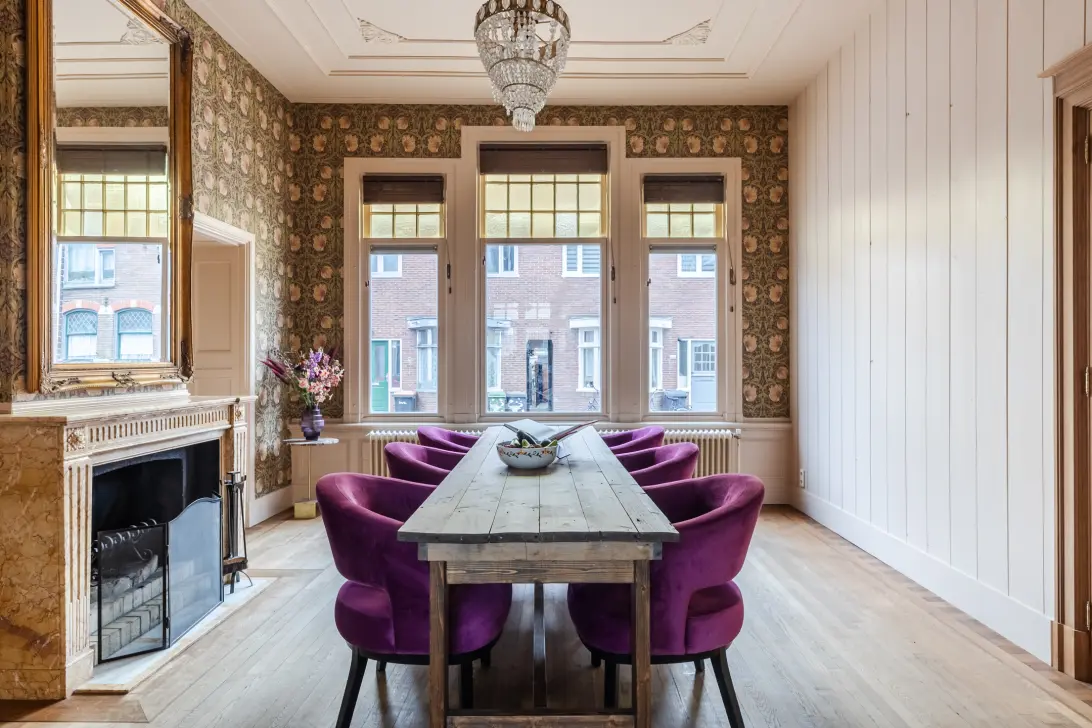 Aan de voorzijde bevindt zich de royale eetkamer met meerdere raampartijen, een werkende schouw en een fraai gedetailleerd plafond dat de historische sfeer van de woning extra onderstreept.
