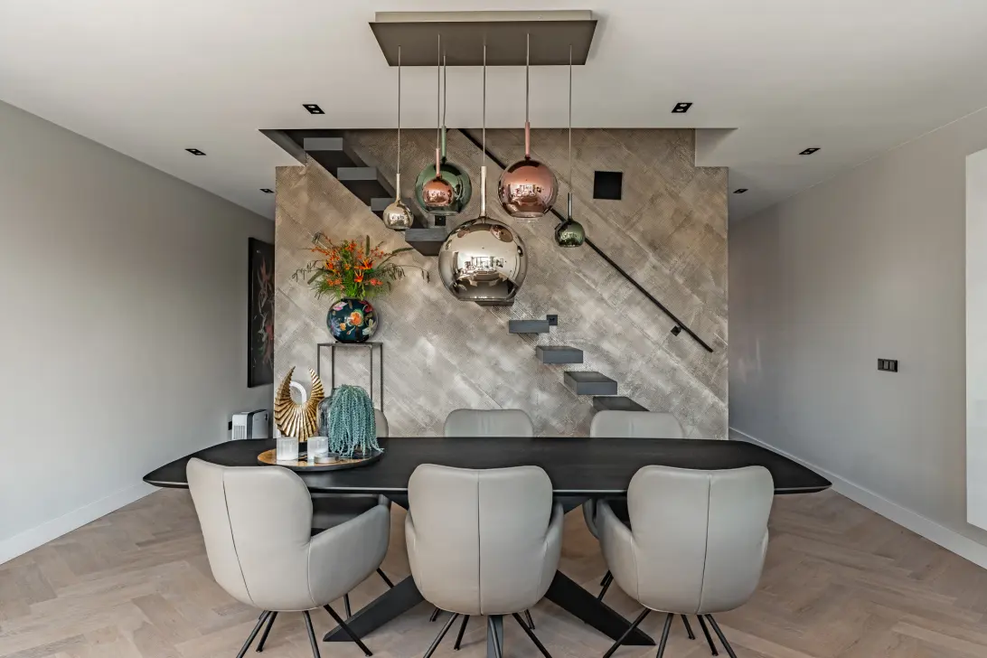 Een andere blikvanger is de open trap naar de eerste verdieping, mooi verlicht en voorzien van een maatwerk trapleuning en speciaal stucwerk.