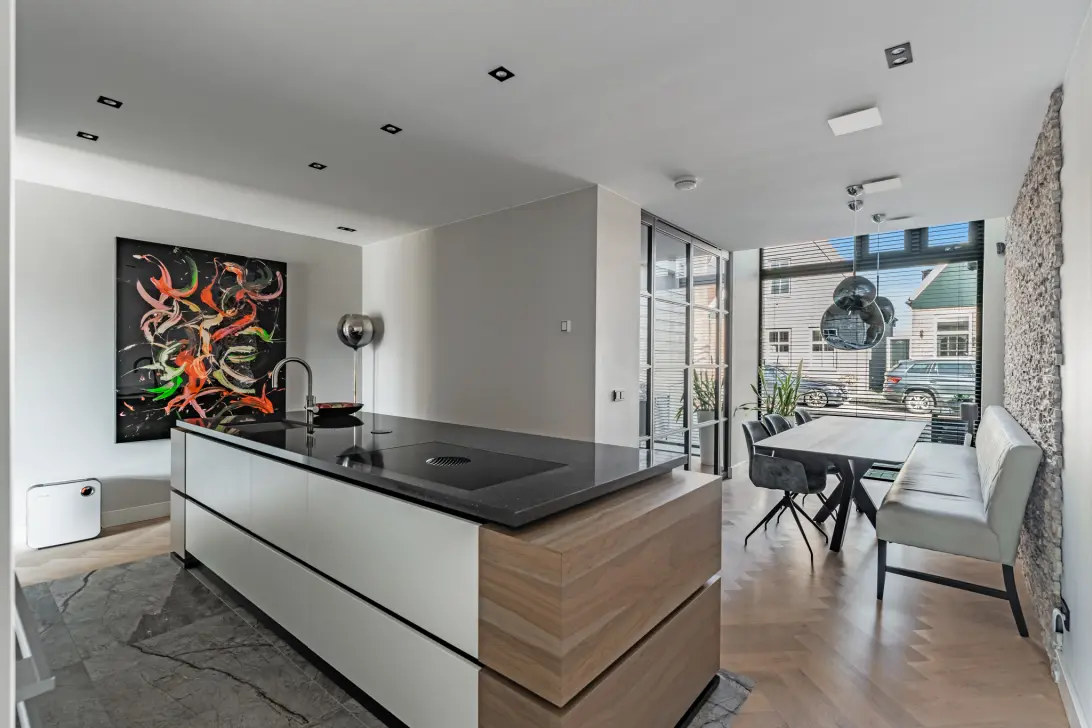 Een van de blikvangers op de begane grond is de luxe open woonkeuken, met een gemarmerde tegelvloer die qua kleur perfect past bij de visgraatvloer. Het grote kook-/spoeleiland biedt, net als de hoge kastenwand met koffiecorner, veel bergruimte. De kastenwand is voorzien van een kader, waardoor het lijkt alsof deze is ingebouwd, en alle denkbare apparatuur van topkwaliteit is ingebouwd. Als je geen concessies wil doen ten aanzien van luxe, dan is dit de perfecte keuken voor jou.