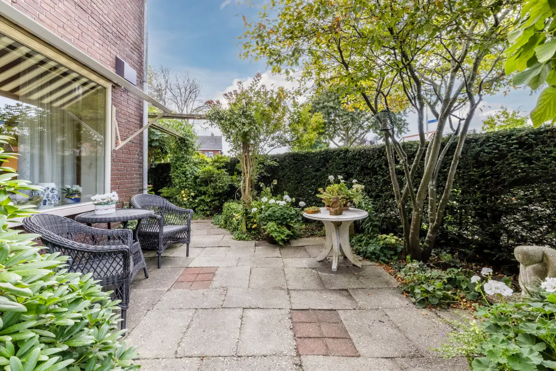 Het huis beschikt over een netjes aangelegde tuin rond de woning, met een gezellige binnentuin. De buitenruimte is sfeervol ingericht met een combinatie van tegels en groen. Er is plek voor meerdere zithoeken, zodat je optimaal kunt genieten van het mooie weer.