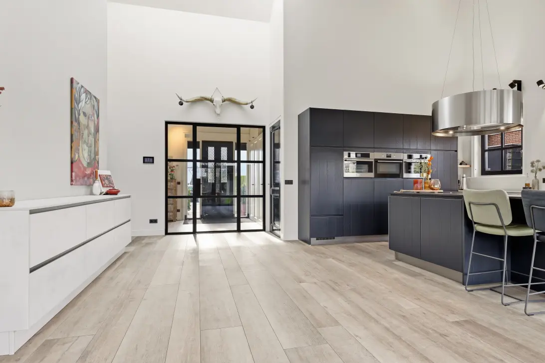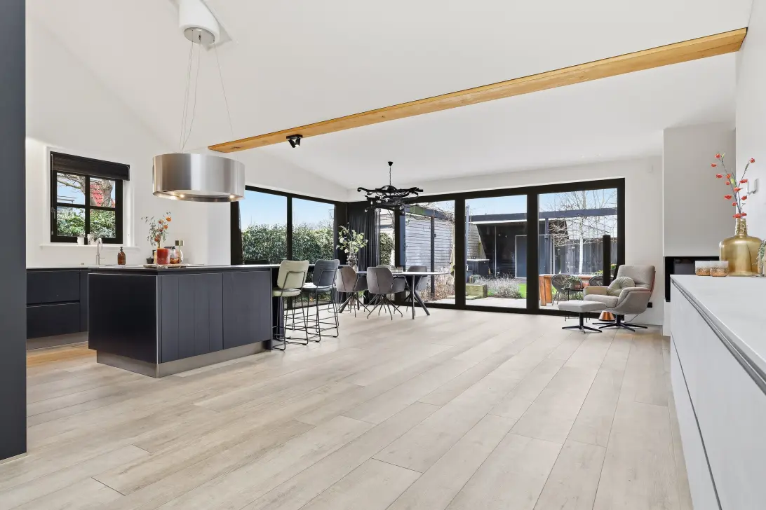 Aan de achterzijde opent de woning zich naar de royale woonkamer met open keuken. Grote raampartijen zorgen voor een prachtige lichtinval en een vrij gevoel richting de tuin. De zithoek is sfeervol gesitueerd rondom de driezijdige allesbrander, die als subtiele roomdivider fungeert tussen wonen en eten. De living loopt naadloos over in de royale open keuken, die is voorzien van diverse inbouwapparatuur, waaronder een kookplaat, oven, combi-oven, vaatwasser, koelkast, vriezer, koffiemachine en een Quooker. Hier kook en leef je in één open, uitnodigende ruimte met zicht op de tuin. Vanuit de woonkamer is er toegang tot het souterrain, een volwaardige verdieping met daglichttoetreding die zich uitstekend leent als extra leefruimte, werkruimte, hobbyruimte of gym.