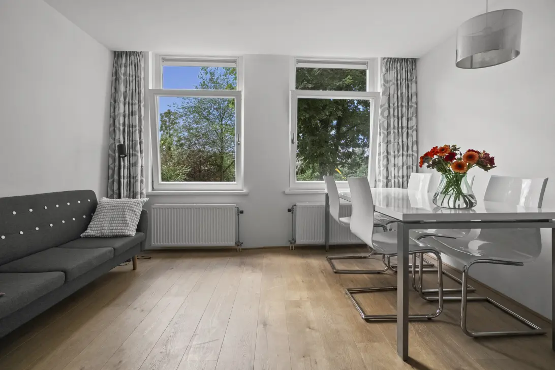 Als we op de eerste verdieping zijn, dan lopen we via de voordeur het appartement naar binnen. Eerst naar de woonkamer, aan de levendige Oostenburgergracht. Je ziet niet alleen de brede straat, maar ook mooie bomen en de boten in de Nieuwevaart. Met een slimme indeling is de woonkamer in te richten met een bank, tv-meubel en een grote eettafel.