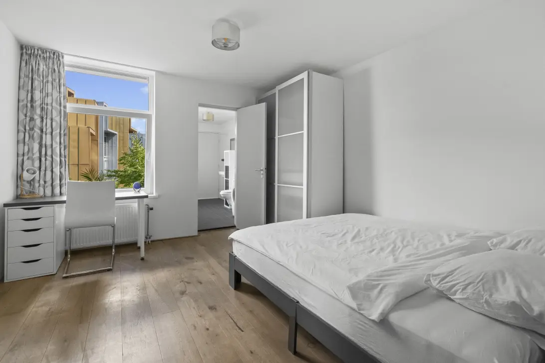 De zeer ruime slaap-/werkkamer bevindt zich aan de rustige achterzijde van het appartement, wat tevens de koele noordoostkant is. Er is meer dan genoeg plek om een tweepersoonsbed, een garderobekast en een bureau neer te zetten. Als je door het raam naar buiten kijkt, dan zie je de opvallende woningen en appartementen op het voormalige terrein van de scheepswerf Wiener & Co. In 2017 kregen de architecten Arons en Gelauff de Zuiderkerkprijs, de prijs voor het beste woningbouwproject in Amsterdam. En als bewoner kun je iedere dag genieten van de prachtige architectuur!
