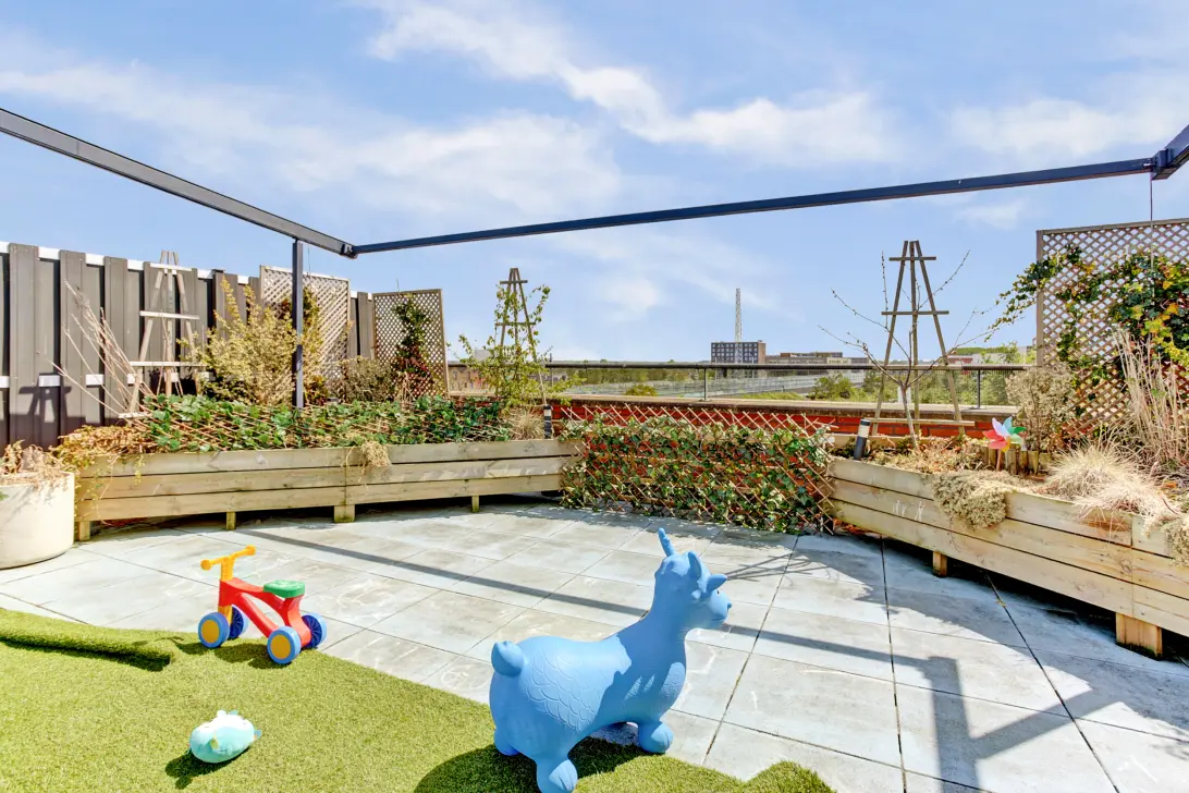 Een van de absolute hoogtepunten van deze maisonnette is het zonnige dakterras op het zuiden. Vanuit de slaapkamer bereikt u via openslaande deuren dit heerlijke terras. Hier kunt u genieten van een fantastisch uitzicht terwijl u ontspant in de zon. Stel u voor: een kopje koffie in de ochtendzon, een boek lezen in de middag of een gezellige barbecue met vrienden en familie in de avond. Dit dakterras biedt u en uw gezin de perfecte plek om van het buitenleven te genieten, zonder ooit uw huis te hoeven verlaten.