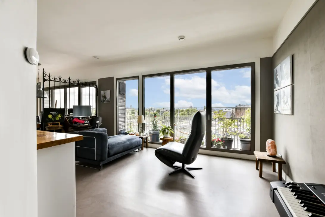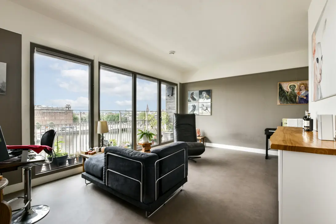 Welcome to Oosterdokskade 31 – a stylishly finished 1-bedroom (2-room) apartment (approx. 65 m²) on the fifth floor of the modern ODE Wharf complex with an elevator, located on Oosterdok Island. Here, you’re not just living in a prime location, but truly living in style. You have an almost 15-meter (!) wide glass facade, a south-facing balcony with folding glass doors, and a breathtaking view – over the water and Amsterdam’s historic skyline.