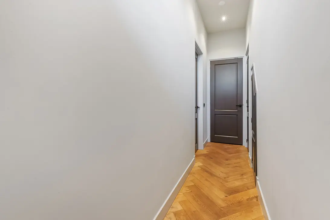 Een tweede hal, bereikbaar vanuit de living, leidt naar de extra slaapkamer en de tegenover gelegen badkamer. De badkamer is luxe afgewerkt in een lichtgrijze kleurstelling en voorzien van een ligbad, separate douche met regendouche, brede wastafel met inbouwkranen, geïntegreerde verlichting en een design-handdoekradiator.
