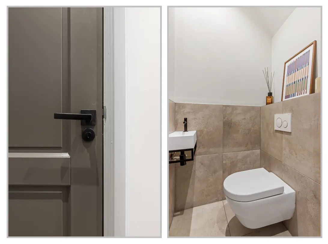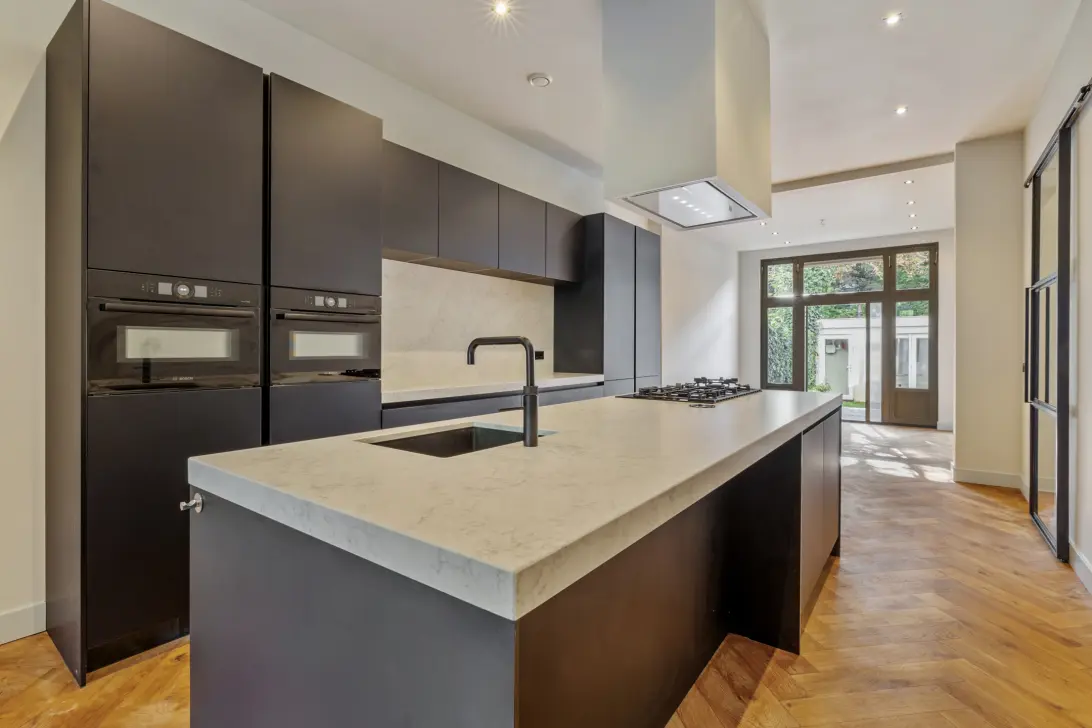 De keuken is een ware eyecatcher: uitgevoerd met greeploze matzwarte kasten en een elegant marmeren werkblad. Uiteraard is de keuken volledig uitgerust met hoogwaardige inbouwapparatuur van Bosch, waaronder een breed 5-pits gasfornuis met wokbrander, Quooker, oven en combi-magnetron.