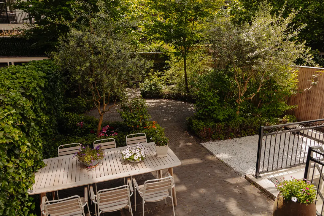 De tuin van ruim 15 meter diep is een absolute asset. Omdat deze omgeven is door groen ervaart men hier rust en privacy. Wonen in de Willemsparkbuurt is koninklijk en residentieel, terwijl de grootstedelijke voorzieningen altijd binnen handbereik zijn en men zo het Vondelpark in loopt.