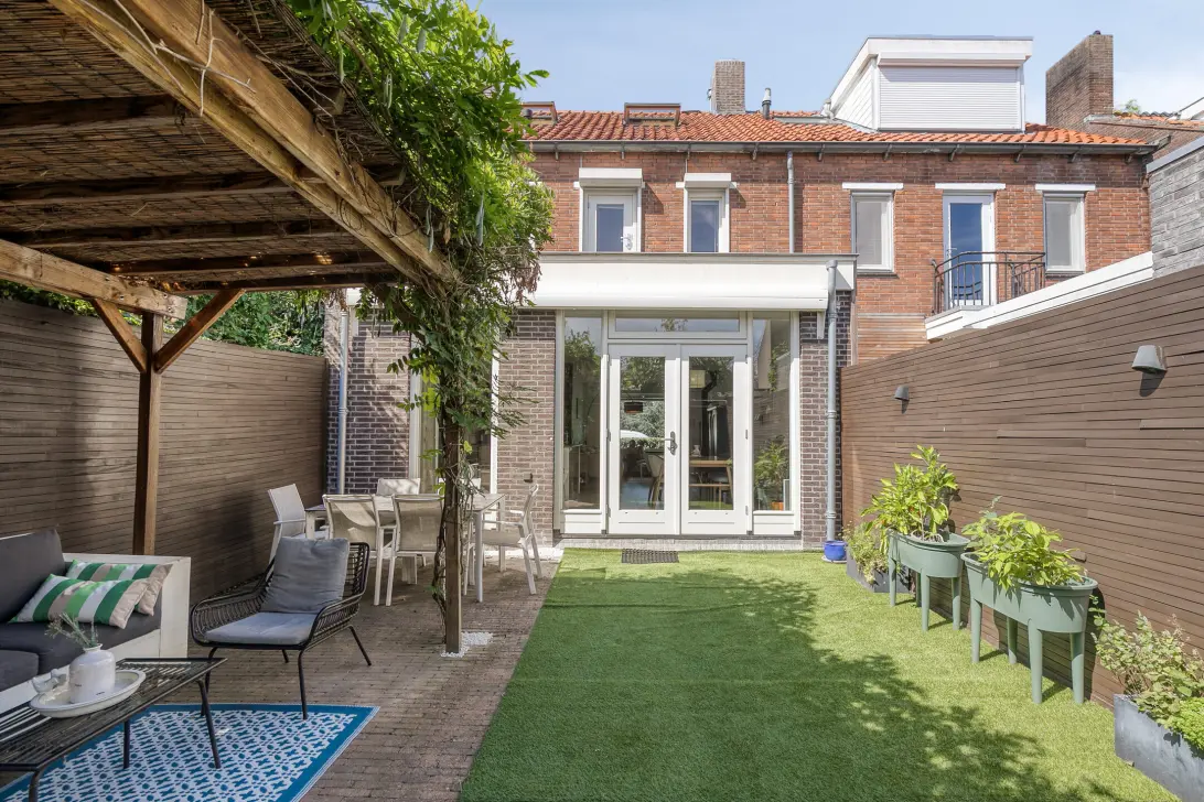 Openslaande deuren leiden naar de besloten achtertuin met schuur en achterom.