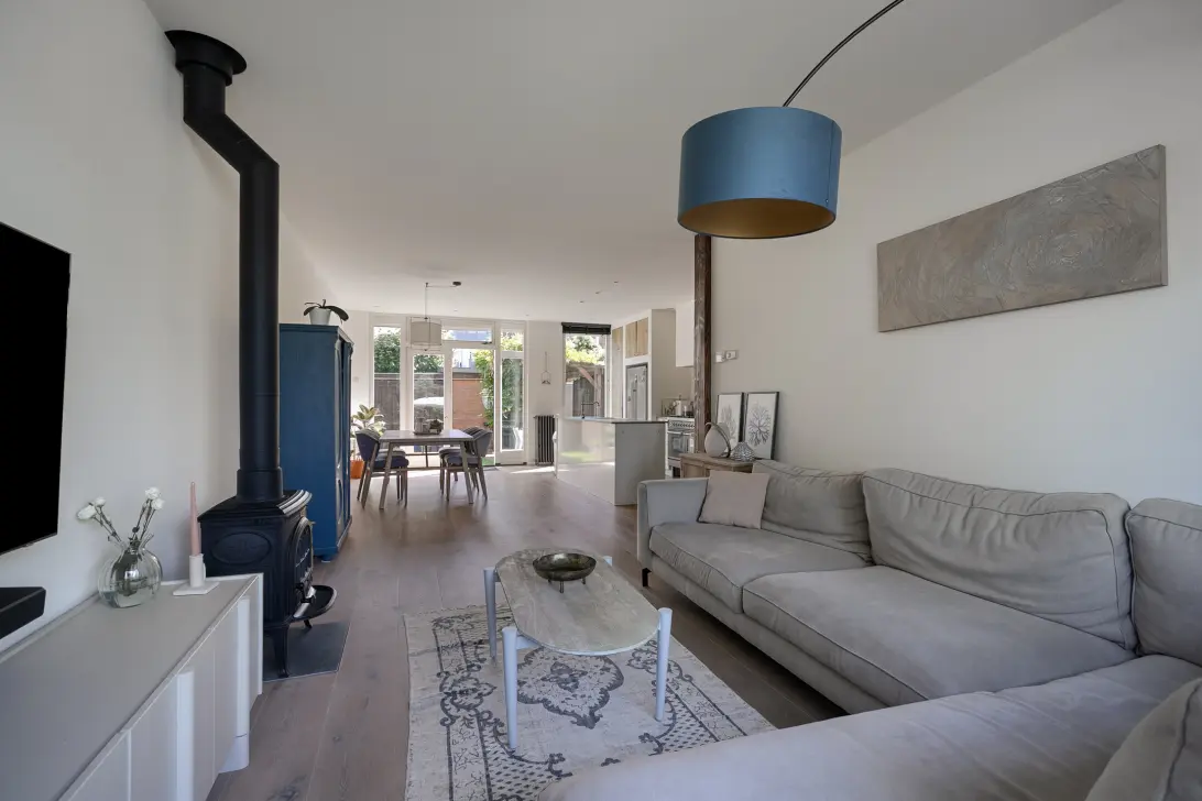 De woonkamer is uitgebouwd en aan de voorzijde ligt een sfeervolle erker. Een houtkachel zorgt voor extra warmte tijdens koude dagen.