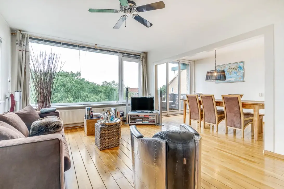 The apartment is fully equipped with double glazing and uPVC frames. New frames with HR++ glass and a beautiful folding door leading to the balcony were installed at the front in 2022. By combining a former bedroom with the kitchen, a spacious kitchen-diner was created. The bathroom has also been enlarged as a result. You'll also benefit from no fewer than two balconies and three storage units.
