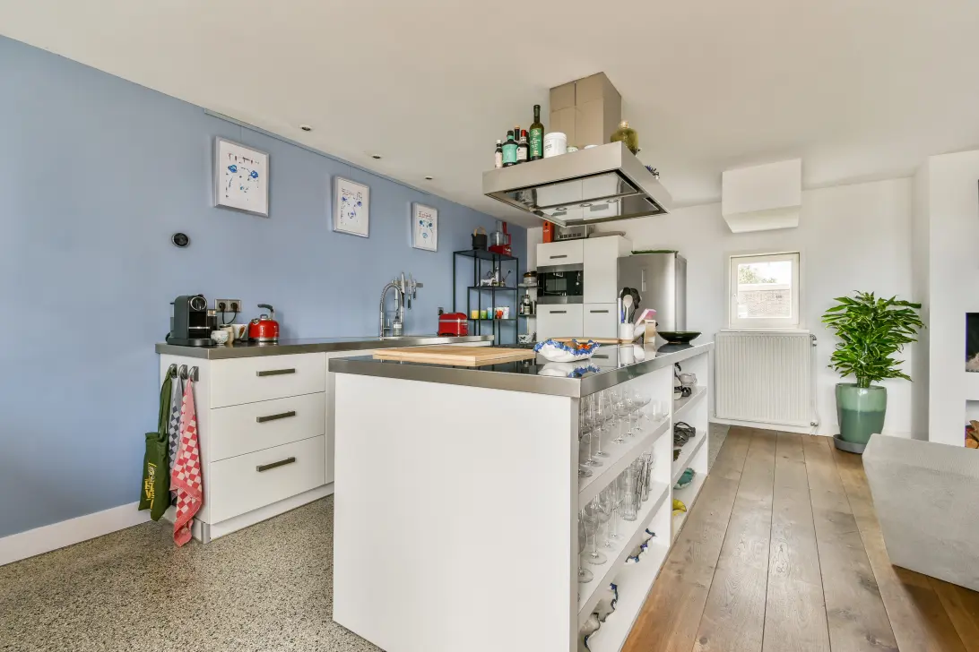 Via de binnentrap bereikt u de woon- en eetkamer met open keuken (met kookeiland) en openslaande deuren naar het fantastische dakterras van (21 m²) en een berging met elektra en verwarming. De moderne keuken heeft een rvs werkblad en is voorzien van een Bosch Solitair 5-pits gasfornuis, vaatwasser, grote vriezer, magnetron, Itho schouw, veel kastruimte en een granito vloer. Het eetgedeelte en de gezellige zithoek met een open haard op hoogte.