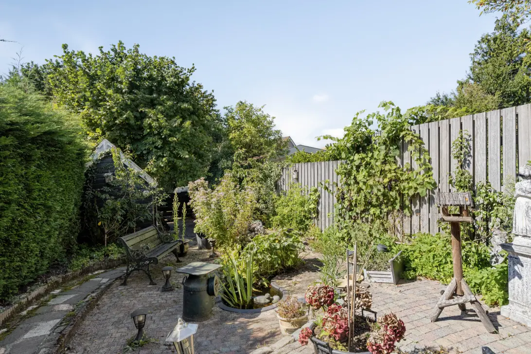 - Fantastische tuin van maar liefst ca. 34 m diep (incl. parkeerplaatsen) gelegen op het zuidwesten, met beplanting, schuren, kippenhok, vijver en achterom