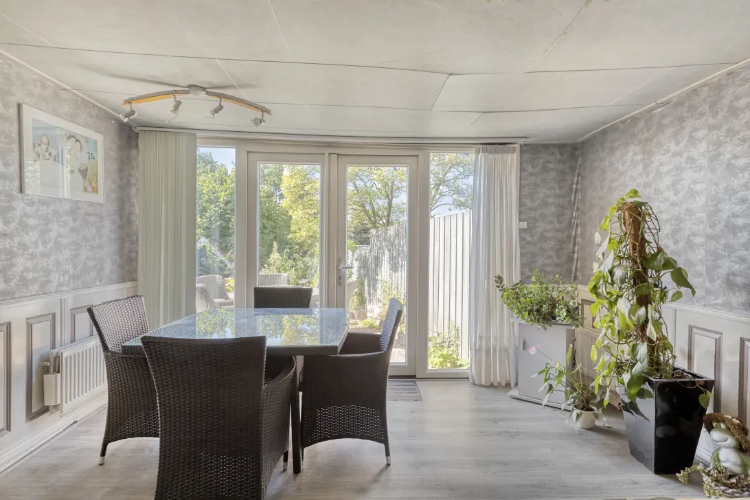 Vanuit de keuken is de eetkamer te betreden. Een fijne ruimte met veel lichtinval door de glazen achterpui met openslaande deuren naar de tuin.