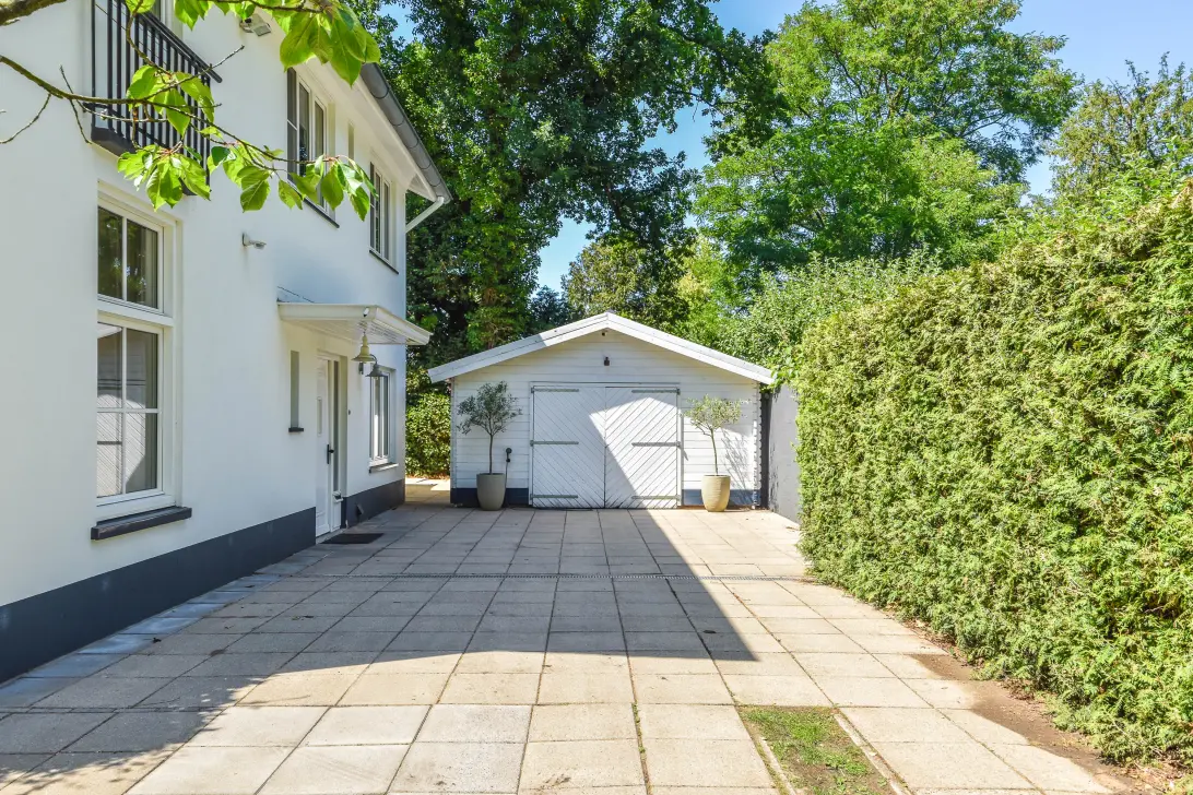 Een vrijstaande houten garage, gebouwd onder het souterrain, voorzien van elektra en plek voor van alles en nog wat; fietsen, golfcarts, en nog veel meer voor de ontspanning. Een aangebouwde houten schuur voor tuinspullen, fietsen etc.