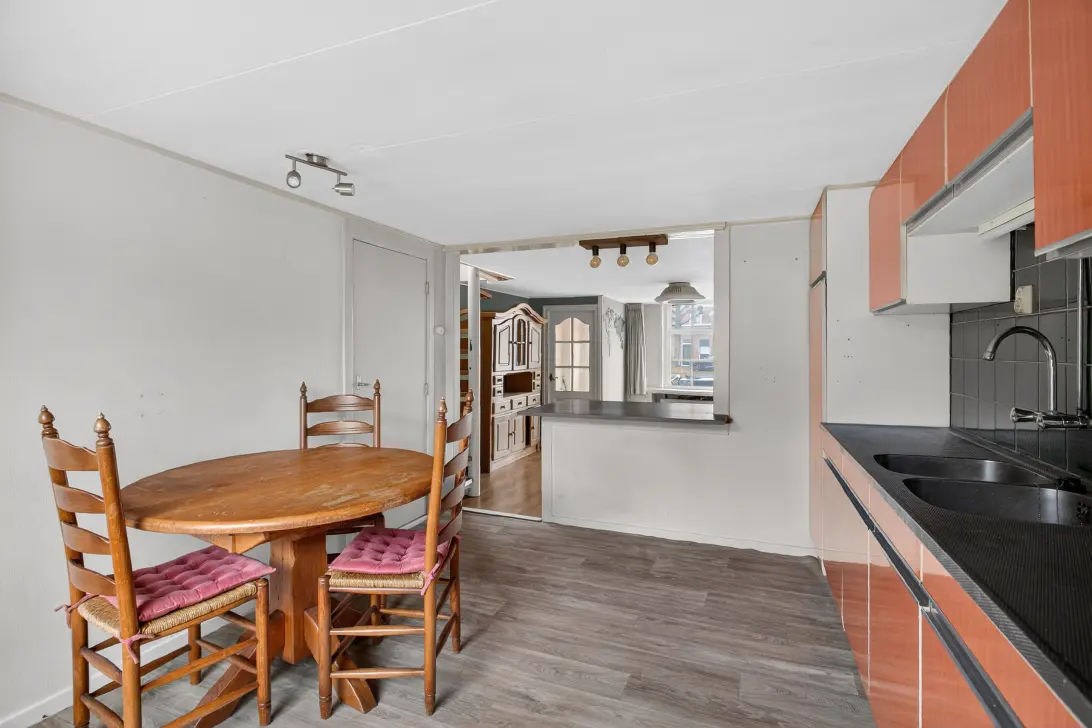 Aan de achterzijde is de eetkeuken, met uitzicht op de tuin en de fijne ochtendzon die naar binnen valt. De keukenopstelling met dubbele spoelbak is toe aan vernieuwing, of je bent een liefhebber van retro die de basis gebruikt om de keuken naar eigen smaak aan te passen.