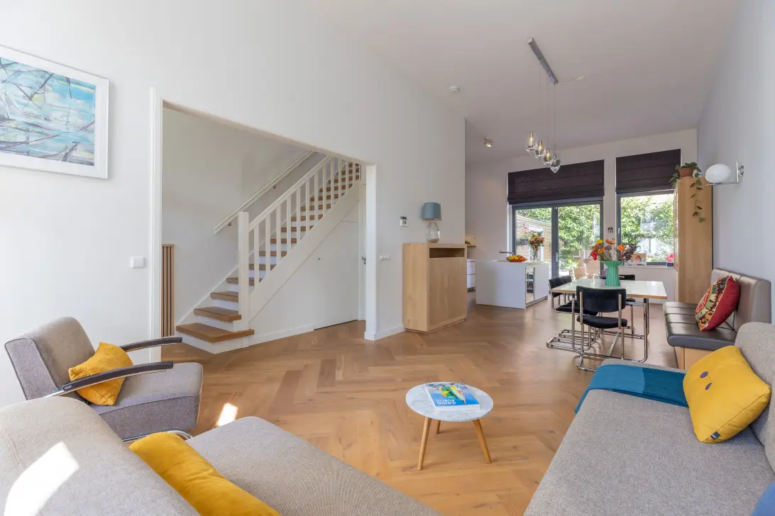De tweede verdieping is bijna een appartement op zich! De helft van deze verdieping heeft een open kap van ruim 6 meter hoog! Er is een riante leefruimte/woonkamer, een slaapkamer, de tweede moderne badkamer met ligbad, derde toilet en wastafel.