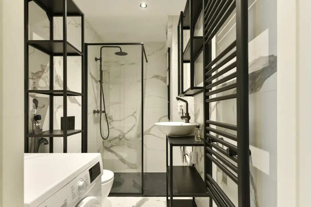 The studio features laminate flooring. The living room/open-plan renovated kitchen includes a 2-burner induction cooktop, built-in refrigerator, combination microwave, and extractor hood. Wooden window frames with single glazing. The bathroom is ultra-modern and features marble-look wall and floor tiles, a walk-in shower with a glass splashback, a wall-hung toilet, a sink, a heated towel rail, and a washing machine connection.