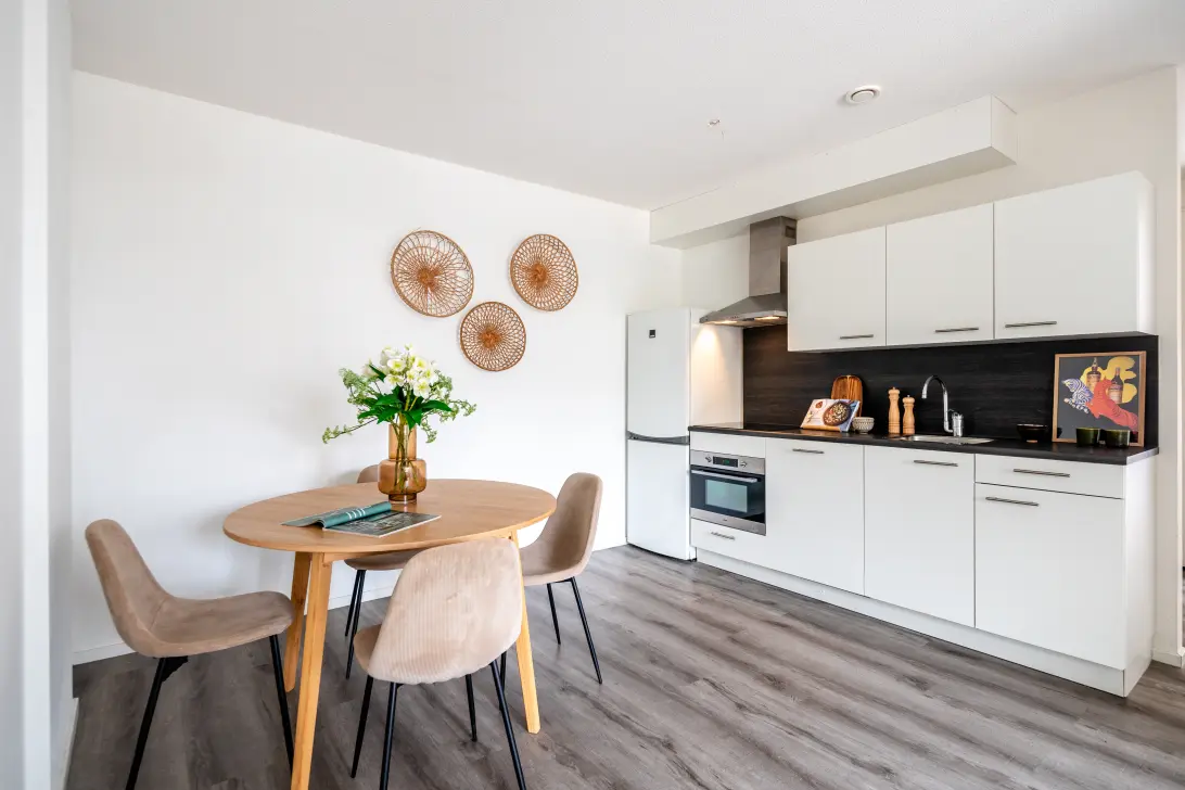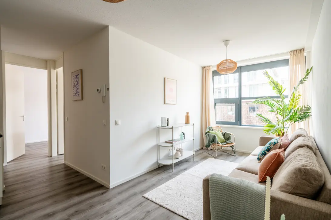 Woonkamer met open keuken en uitzicht over het plein, ruime slaapkamer aan de voorzijde, tweede ruime slaapkamer aan de voorzijde, badkamer met dubbele wastafel, douche en een separate wc vanuit de hal.