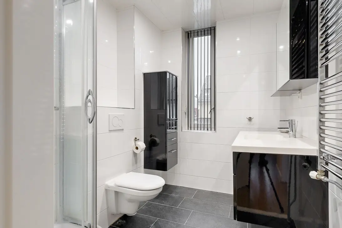 Eerste verdieping: overloop, 3 slaapkamers en witte badkamer met douchecabine, wastafel in meubel, 2e wandcloset en designradiator.