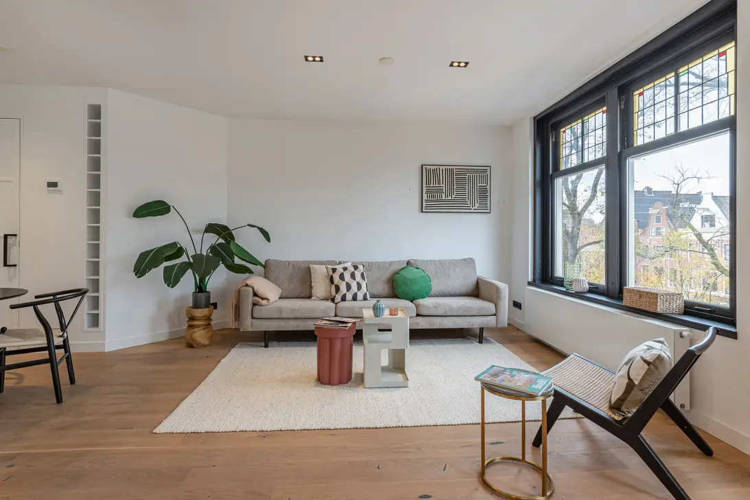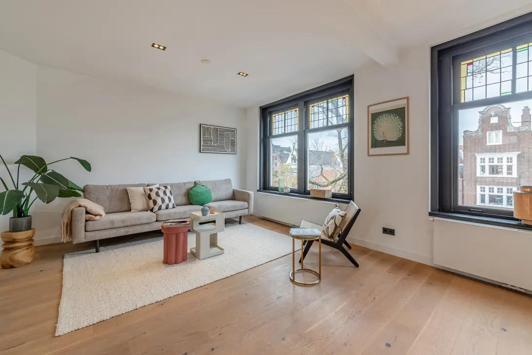 A charming and beautifully renovated top floor apartment of approximately 80 m² located in one of the most attractive streets of the lively Jordaan district! The apartment occupies the third and fourth floors and owns the staircase from the second floor. From the living room, it overlooks the Palmgracht public garden. You will find this inviting living room on the third floor as well as a modern semi-open kitchen and a sunny south-facing balcony. On the fourth floor are two well-sized bedrooms with modern steel-look doors and beautiful, very high beamed ceilings. The luxurious bathroom features a freestanding bathtub, walk-in shower, vanity, and designer radiator. A truly beautiful and renovated apartment with no work required, in a wonderful location right in the heart of the Jordaan district! From the living room, you can peak on to the Brouwersgracht! Both Westerstraat and Haarlemmerstraat are within walking distance, where you'll find shops for daily groceries, many coffeeshops, bakeries & fine restaurants, and trendy boutiques. Both Lindengracht & Noordermarkt’s Saturday food markets are also under five min. walking distance.