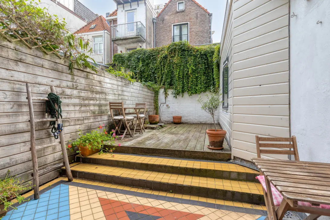 De achtertuin is ingedeeld met een terras en een houten vlonder, ideaal voor een zit- of eetgedeelte in de buitenlucht.