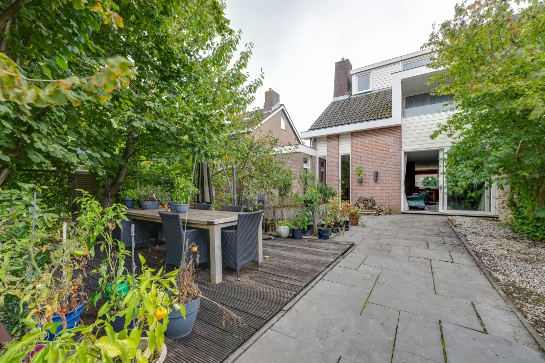 De achtertuin is een echte eyecatcher: gelegen aan het water met een eigen steiger en een houten berging. Op elk moment van de dag kun je kiezen voor zon of schaduw, hier geniet je in alle rust van de zon, het uitzicht en de ruimte om te ontspannen of te varen.