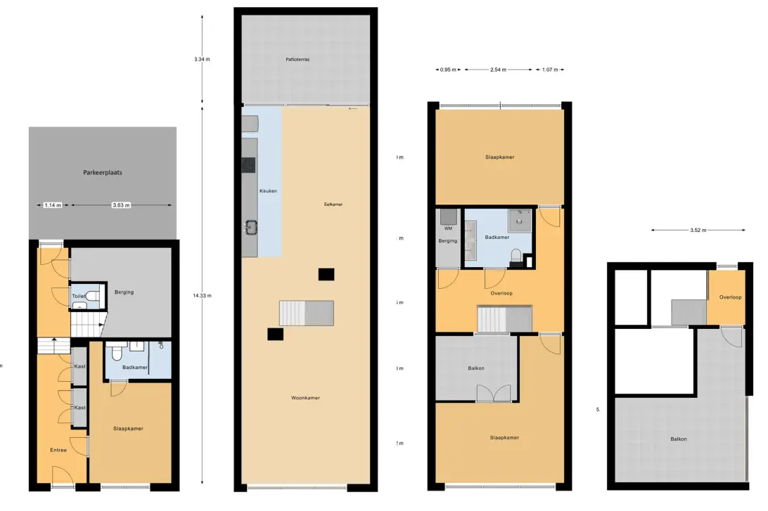 Groot patio terras aan de keuken, patioterras aan de slaapkamer op de tweede verdieping en een dakterras op het zuiden, totaal 44 m2 buitenruimte.