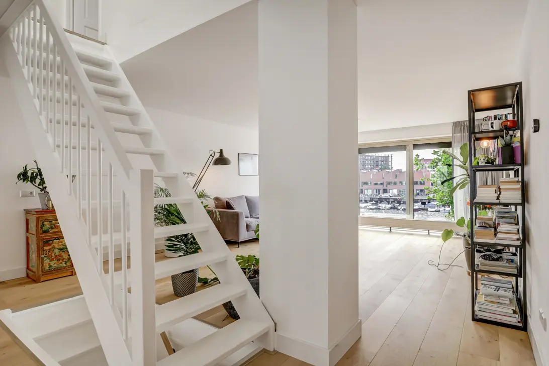 The first floor is a very open space, with the living room at the front of the house, facing south. The large windows immediately catch the eye, overlooking the water of the Spoorwegbassin and the marina on the other side.