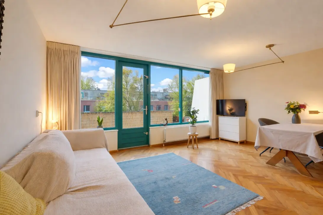 The rear room is accessible both from the hallway and the kitchen, is currently used as the living room, and is equipped with an electric awning. The front room previously served as the living room and is now used as a bedroom. This room offers attractive views over the Rietlandpark and can easily be converted into two separate bedrooms (see floor plan).