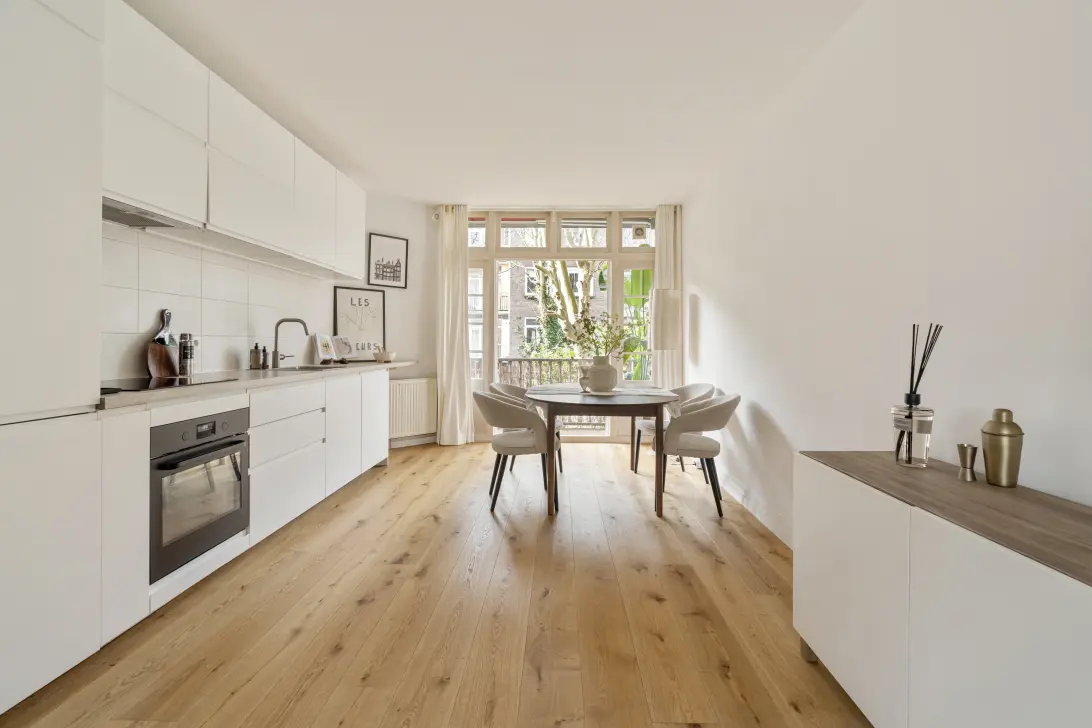 De royale woonkamer met open keuken is bijna 10 meter diep en vormt het hart van het appartement. Dankzij de grote ramen met karakteristiek glas-in-lood valt hier veel natuurlijk licht naar binnen. Vanuit het zitgedeelte heb je een prachtig uitzicht over het groene Paramariboplein en de Kostverlorenvaart.