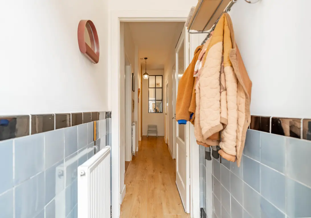 Via je eigen entree op de begane grond kom je de woning binnen. Vanuit de hal heb je toegang tot alle vertrekken, waaronder de verzorgde badkamer en het separate toilet. De originele wandtegeltjes in de gang geven direct karakter, en de vaste inbouwkasten bieden extra bergruimte. Vanuit de gang heb je bovendien een sfeervol doorkijkje naar de keuken.