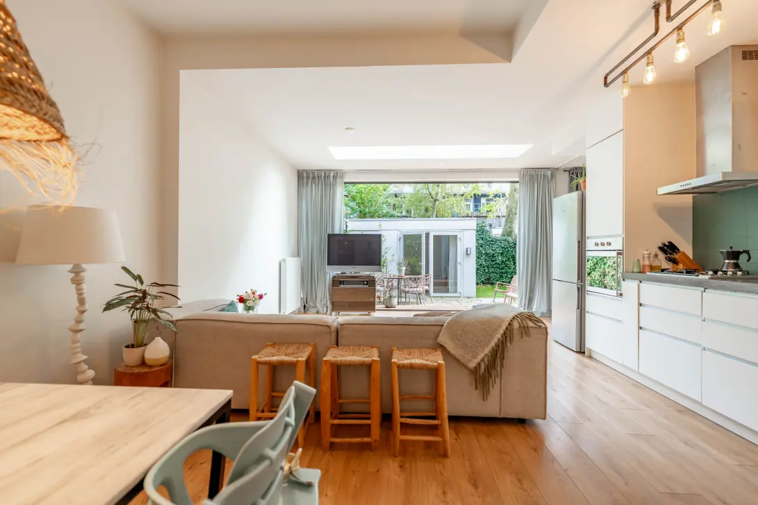 De royale woonkamer met open keuken ligt aan de achterzijde van de woning en biedt een prachtig uitzicht op de tuin. Dankzij de grote harmonicadeuren stroomt het daglicht rijkelijk binnen en lopen binnen en buiten op zomerse dagen naadloos in elkaar over. De sfeervolle inbouwkasten voegen extra warmte en charme toe aan de ruimte.