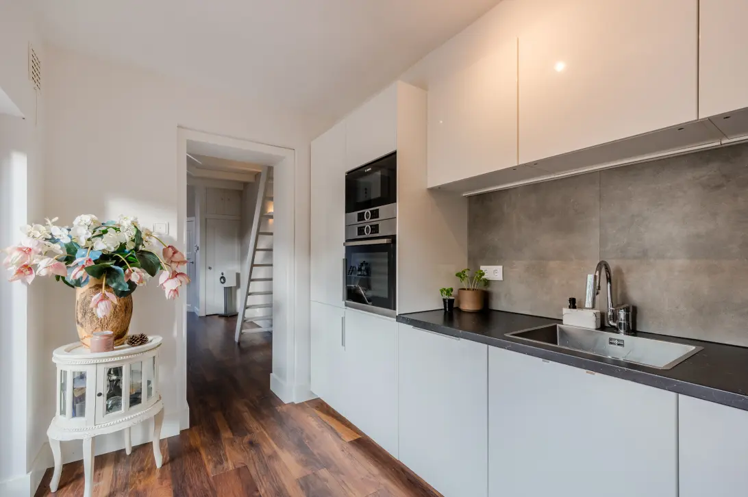 De keuken bevindt zich aan de achterzijde van het huis. Deze is uitgevoerd in een hoekopstelling en heeft een strak design met witte keukenkastjes, een zwart werkblad en een donkergrijs achterblad. De keuken is uitgerust met de volgende apparatuur: vaatwasser, gasfornuis, afzuigkap, oven, magnetron, koelkast en vriezer. De keukenruimte heeft openslaande deuren naar de achtertuin.