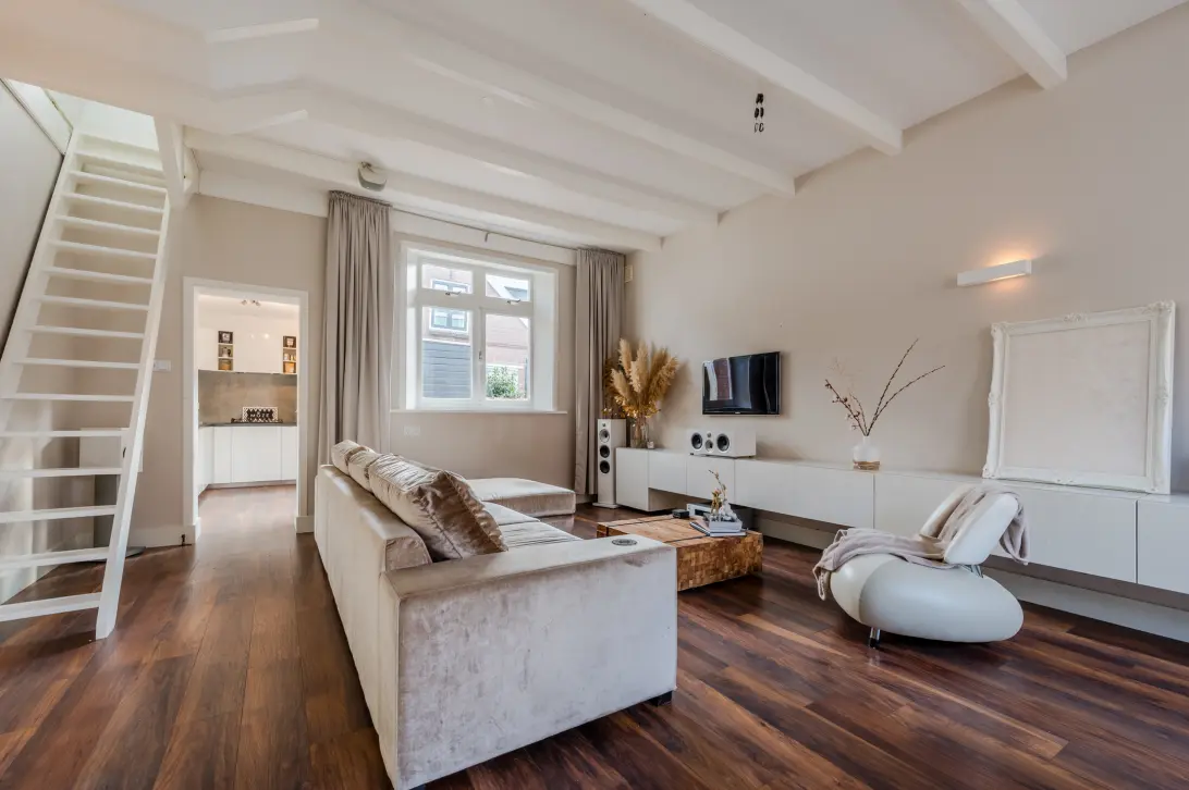 De woonkamer is ruim van formaat en voorzien van een nette, donkere vloer. De wanden zijn hier keurig afgewerkt in warme kleuren. Er zijn nog enkele authentieke details aanwezig, zoals het balkenplafond. Dankzij de grote ramen geniet je hier van een prettige lichtinval. In de woonkamer staat de open trap naar de eerste verdieping.