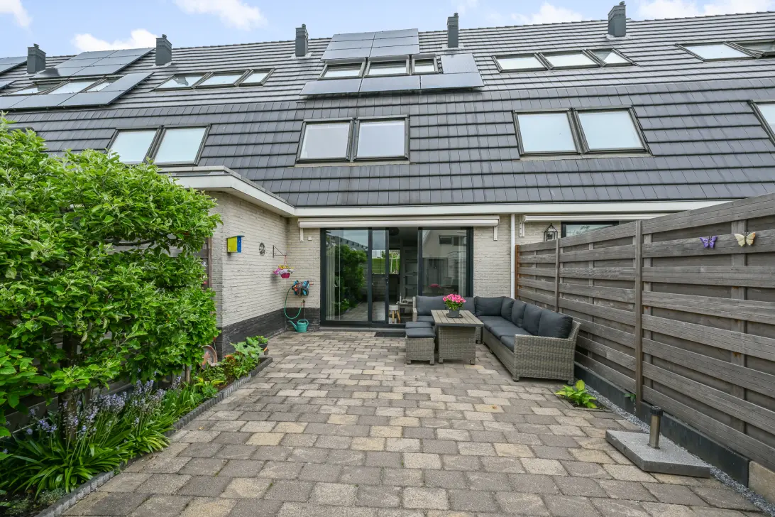 Via de schuifdeuren bij de keuken stap je zo de gezellige, goed onderhouden achtertuin in. Dit is een heerlijke plek waar je in alle rust kunt genieten van je buitenruimte. In de tuin vind je bovendien een berging met elektriciteitsvoorziening en een eigen achterom.