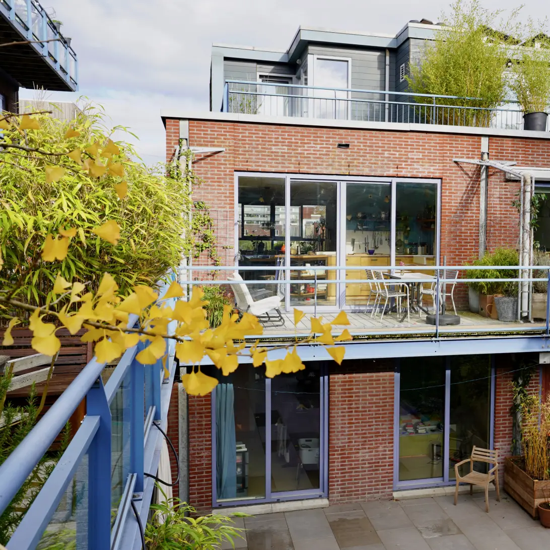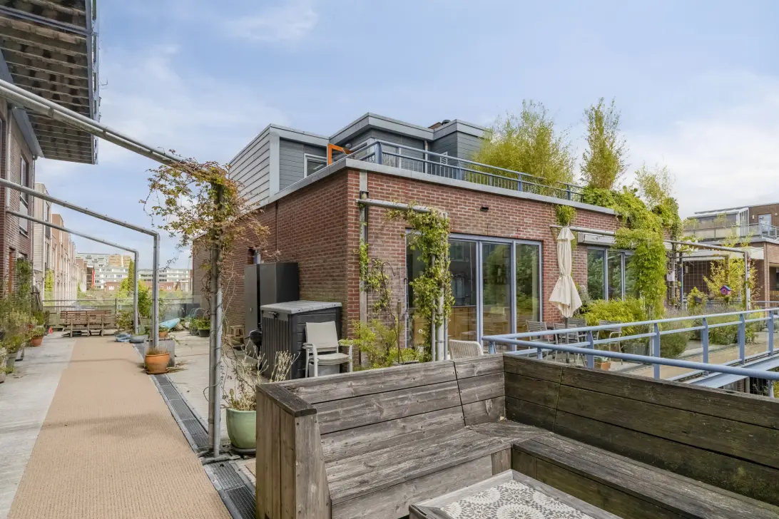Aan zowel de voor- als achterzijde ligt een dakterras, vóór met uitzicht op de wijk en achter op de gemeenschappelijke binnentuin.