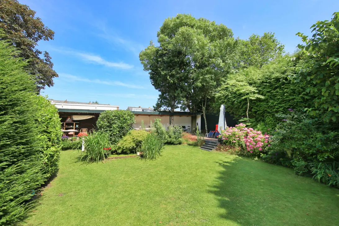 De ruime op het noordoost gelegen achtertuin heeft een breedte van circa 24 meter en diepte van circa 24 meter. De tuin is voorzien van gras, perken met beplanting en diverse terrassen, een berging van circa 9 m² en een zeer brede overkapping, een poort naar de achtergelegen steeg en toegang tot de zuidwest gelegen voortuin waar zich nog 2 bergingen bevinden, van circa 4 m² en 5 m² en een circa 14 meter lange oprit voor meerdere auto's.