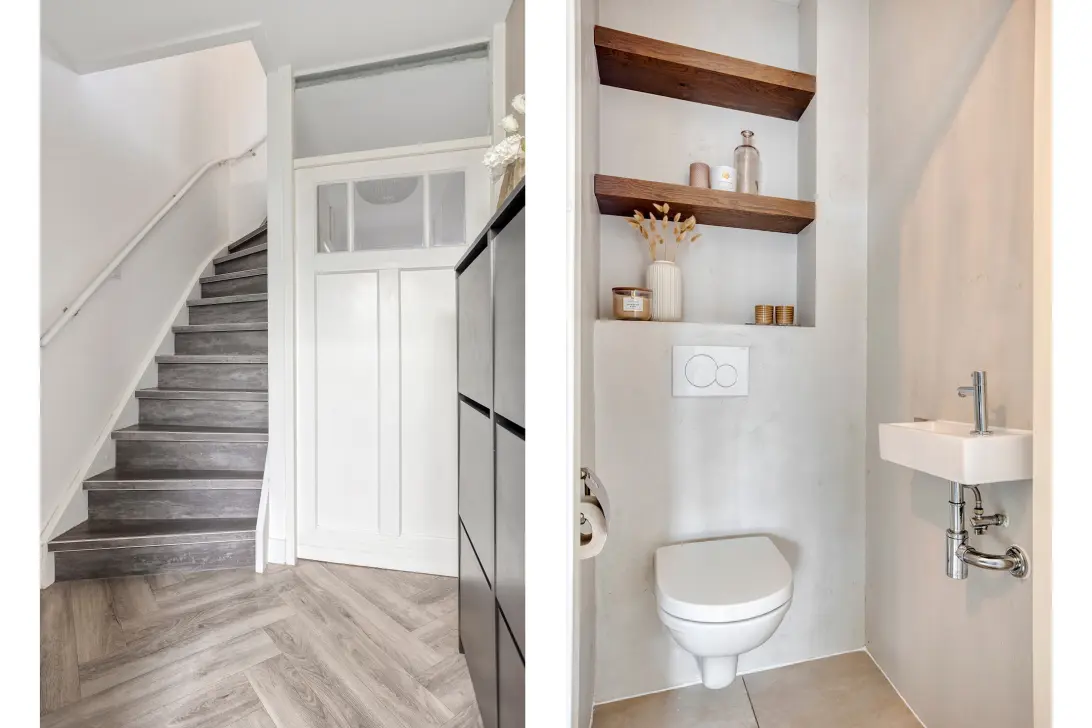 Upon arrival, the neat front garden immediately catches the eye. Through the hall, which features a modern separate toilet, you enter the cozy living room. The beautiful herringbone PVC floor with underfloor heating instantly gives a luxurious feel. Thanks to the large windows, you can enjoy bright natural light throughout the day.