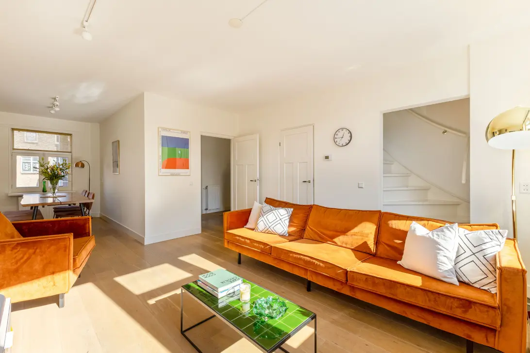 The living room is located at the front of the apartment and is very bright. From here, you have a lovely unobstructed view of Pienemanstraat and the charming Vincent van Goghstraat.